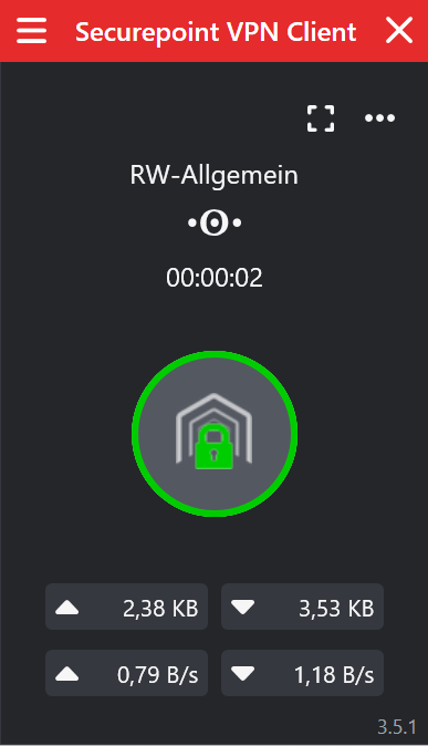 Ändert die Schaltfläche die Farbe in grün wurde die VPN Verbindung erfolgreich hergestellt. Das Fenster kann jetzt geschlossen werden.